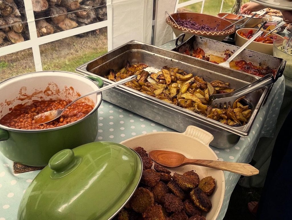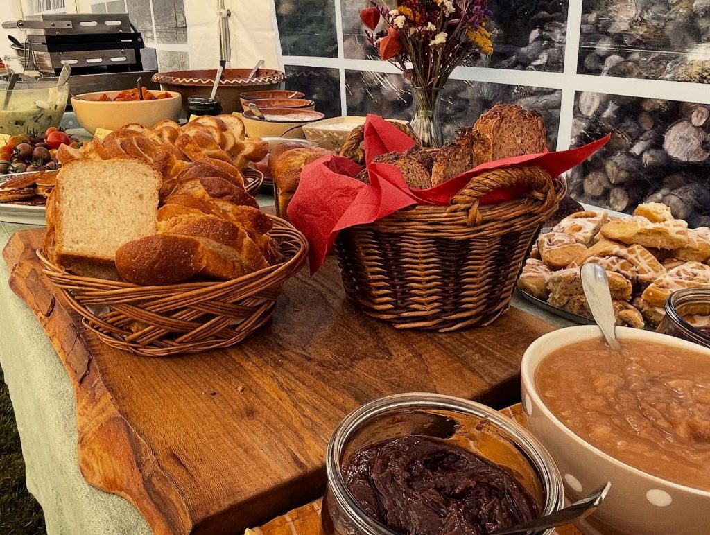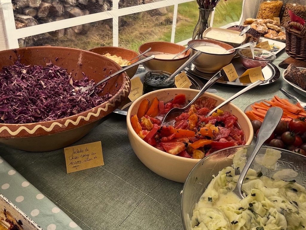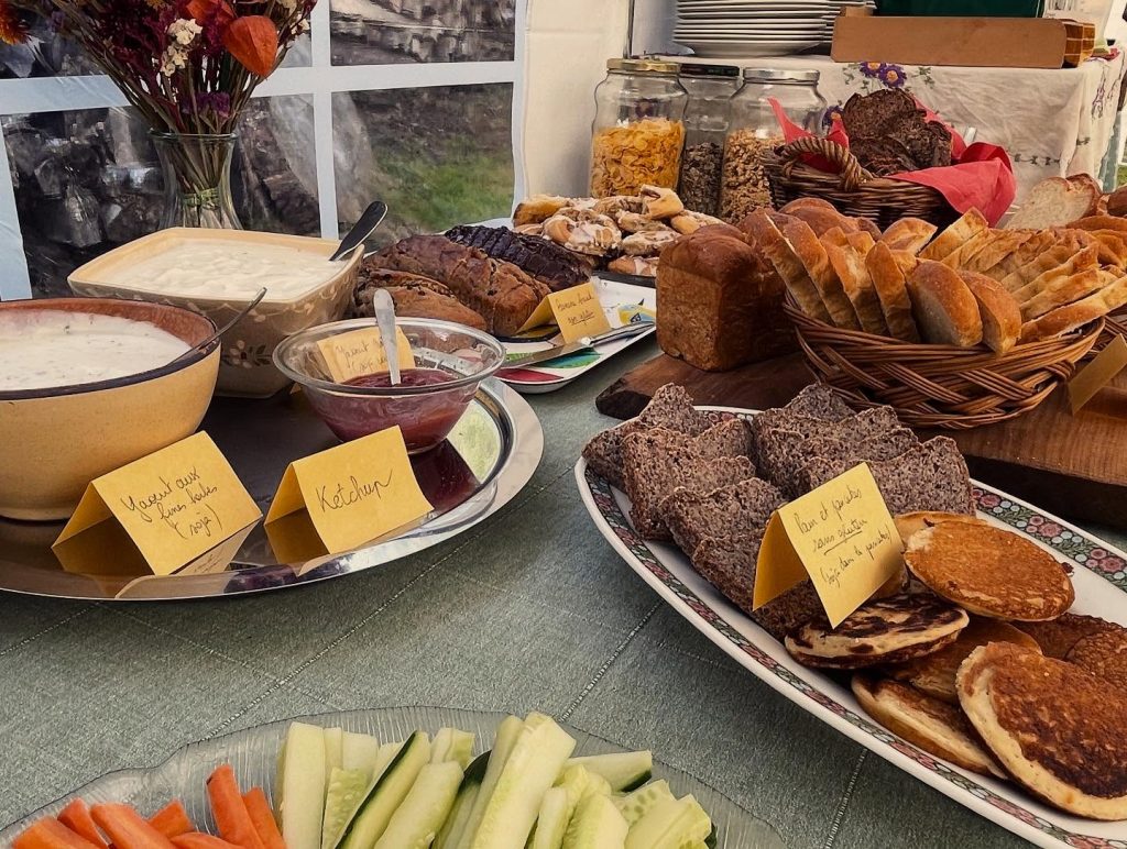 Au menu : gaufres en libre service, potatoes, beans à la tomate, falafels, tomates du jardin à la provençale, salades, tartinades, brioches, cinnamon rolls, pain au levain, banana breadu, le tout accompagné de boissons chaudes bio et équitable, et de jus frais minute en centrifugeuse en libre service.